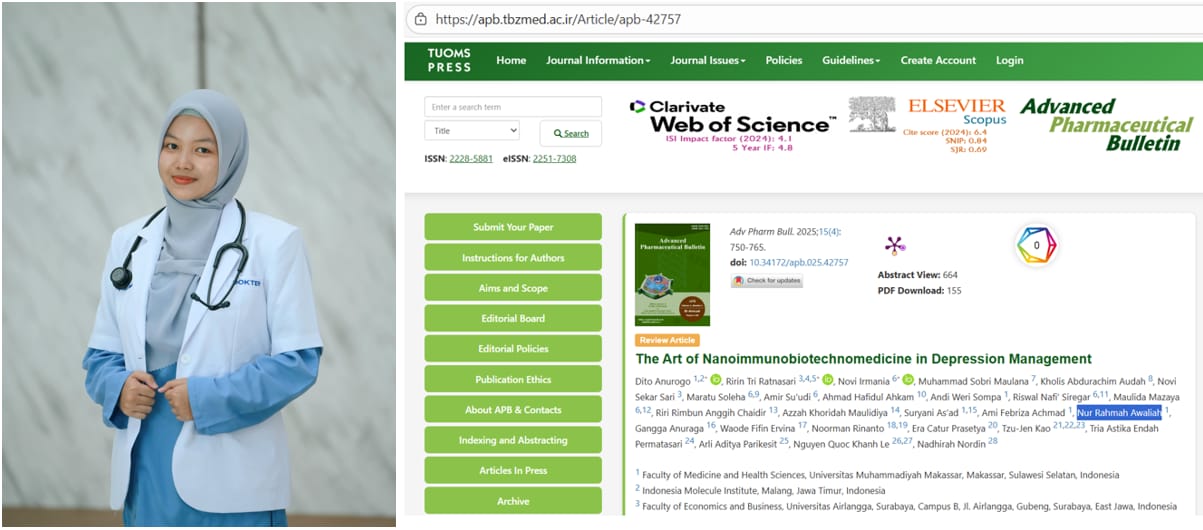 KHITTAH.CO, Makassar — Sebuah prestasi gemilang tingkat Internasional berhasil diukir oleh dokter alumnus Fakultas Kedokteran dan Ilmu Kesehatan (FKIK) Universitas Muhammadiyah (Unismuh) Makassar, dr. Nur Rahmah Awaliah. Baru dua hari setelah melaksanakan sumpah dokter pada 22 September 2025, manuskripnya bersama 25 ilmuwan lain berhasil diterima di jurnal internasional bereputasi tinggi, Advances in Pharmaceutical Bulletin, Scopus Q1.