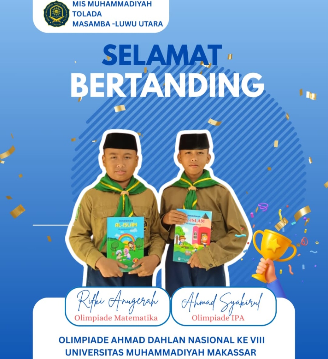 Dua santri yang menjadi delegasi MIS Muhammadiyah Tolada adalah Rifki Anugrah, yang akan berlaga pada cabang Olimpiade Mata Pelajaran Matematika, serta Ahmad Syakirul, yang akan berkompetisi pada cabang Olimpiade Mata Pelajaran Ilmu Pengetahuan Alam (IPA).