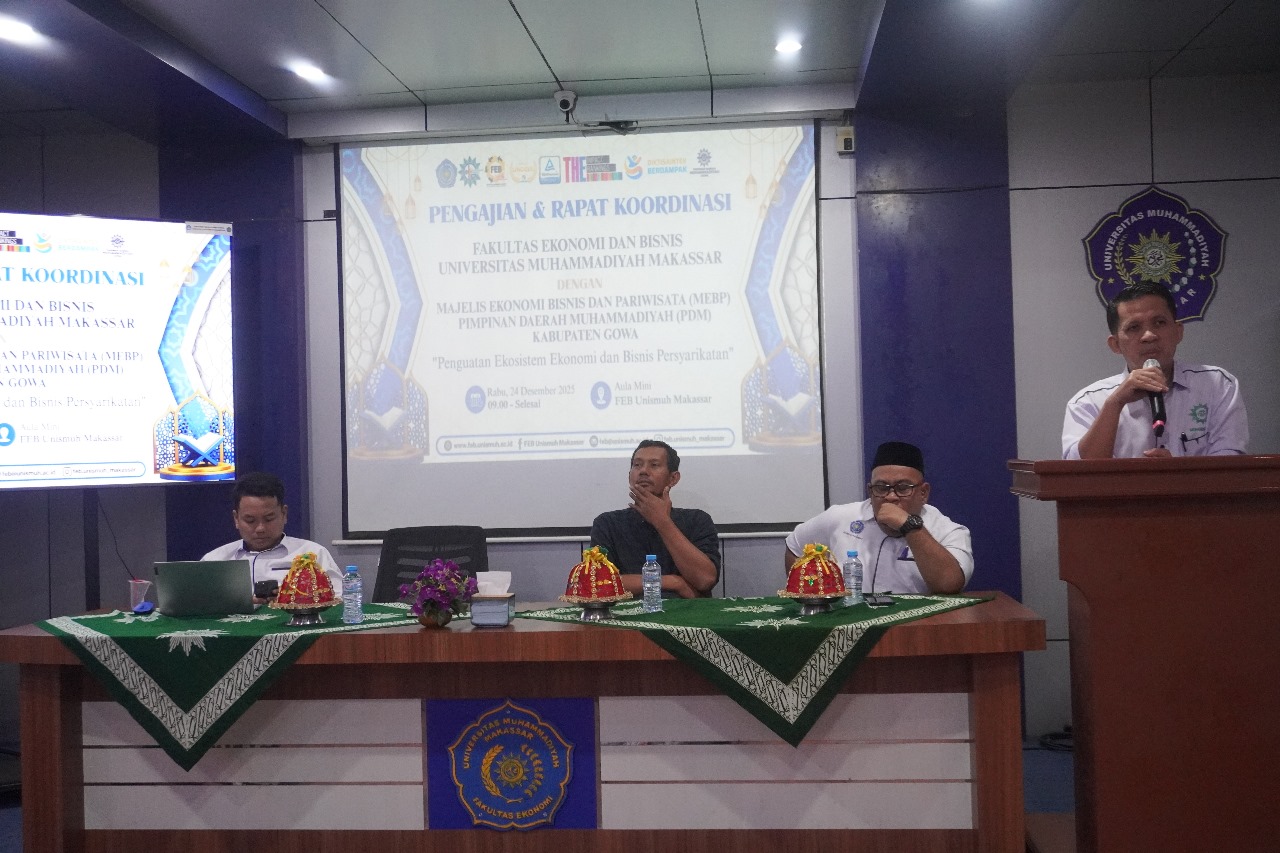 Khittah.co, Makassar – Fakultas Ekonomi dan Bisnis (FEB) Universitas Muhammadiyah (Unismuh) Makassar menjalin kolaborasi dengan Majelis Ekonomi, Bisnis dan Pariwisata (MEBP) Pimpinan Daerah Muhammadiyah (PDM) Gowa melalui pengajian dan rapat koordinasi bertema Penguatan Ekosistem Ekonomi dan Bisnis Persyarikatan, Rabu, 24 Desember 2025.Kegiatan berlangsung di Aula Mini Lantai 8 Gedung Iqra, Kampus Unismuh Makassar.