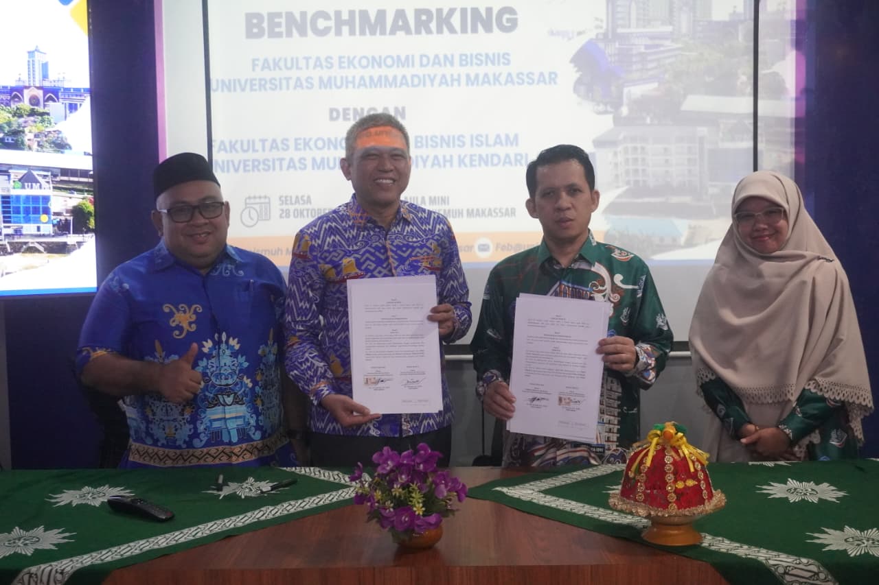 Khittah.co, Makassar  — Fakultas Ekonomi dan Bisnis (FEB) Universitas Muhammadiyah (Unismuh) Makassar menerima kunjungan benchmarking dari Fakultas Ekonomi dan Bisnis Islam (FEBI) Universitas Muhammadiyah Kendari, Selasa 28 Oktober 2025. Kegiatan berlangsung di Ruang Teater Lantai 2 Menara Iqra Unismuh Makassar dan difokuskan pada pertukaran pengalaman serta penguatan implementasi kurikulum Outcome Based Education (OBE) di lingkungan fakultas.