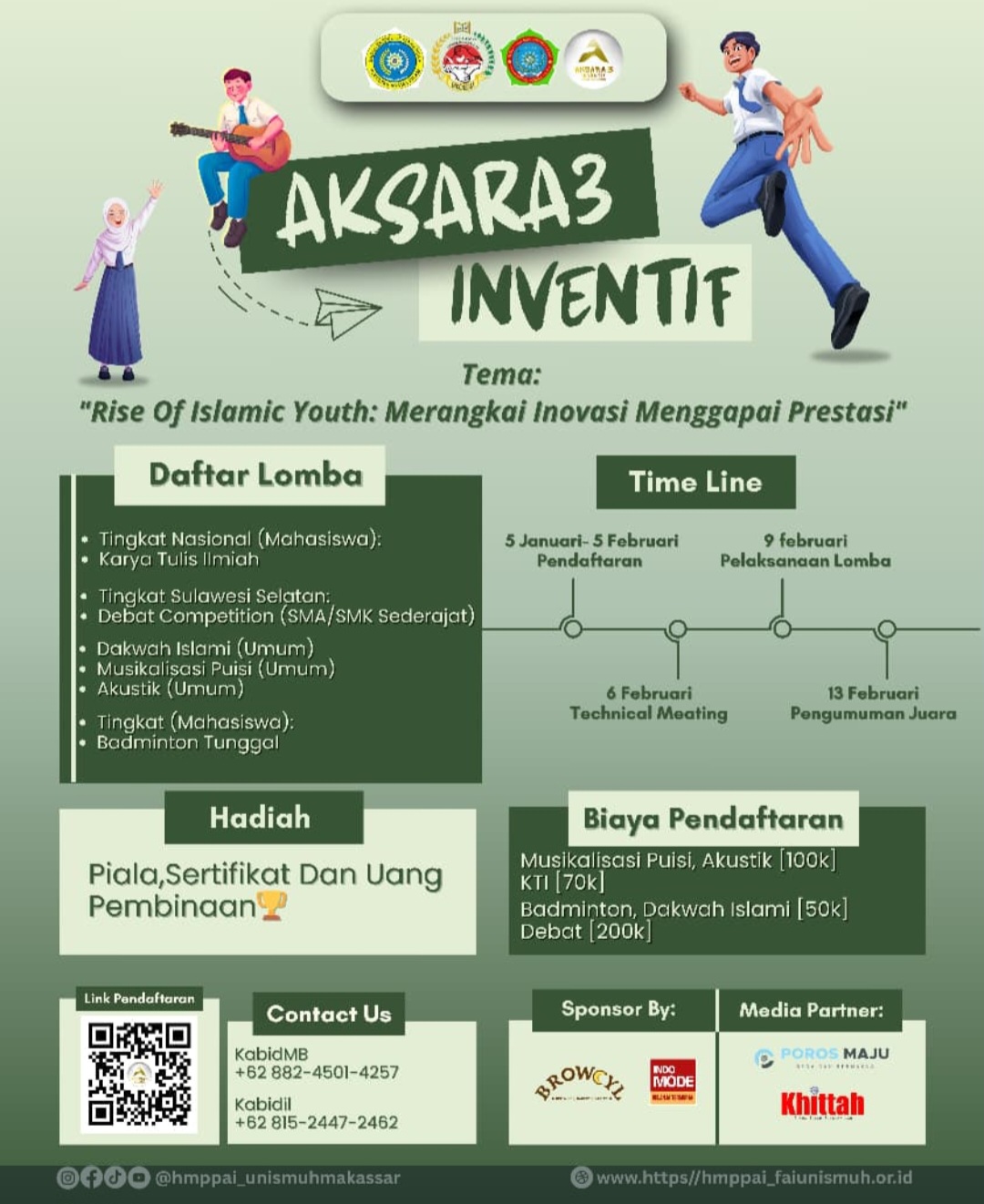 Kegiatan ini dirancang sebagai upaya strategis untuk mendorong generasi muda Islam agar mampu tampil kreatif, inovatif, dan berprestasi, baik di bidang akademik maupun non-akademik. AKSARA 3 INVENTIF menghadirkan beragam cabang lomba yang mencerminkan keseimbangan antara intelektualitas, seni, dakwah, dan sportivitas.