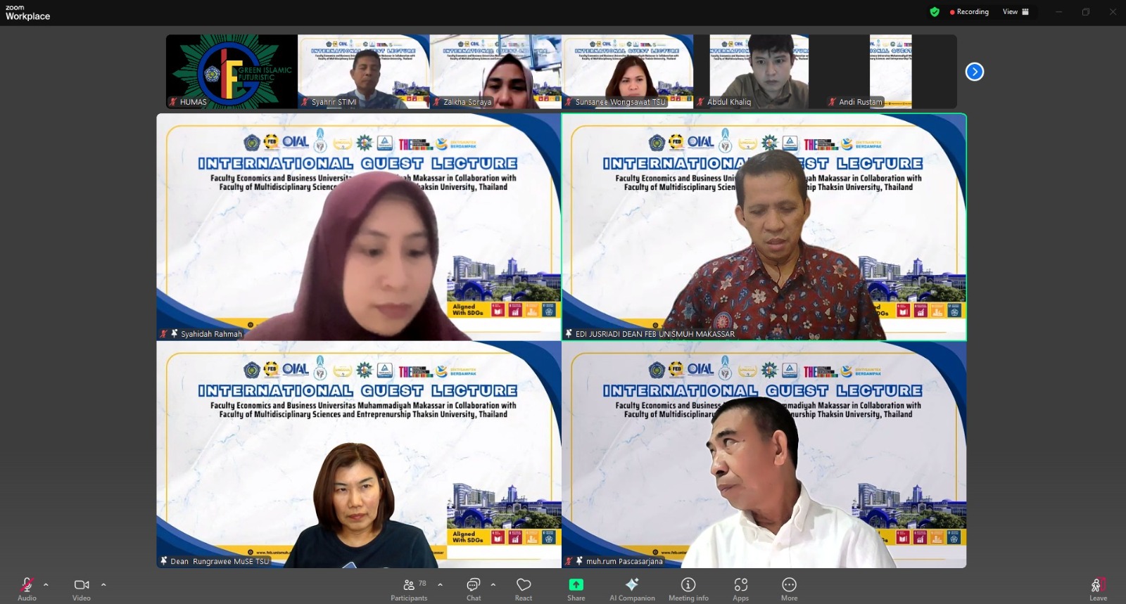 “Selamat datang pada kegiatan International Guest Lecture Fakultas Ekonomi dan Bisnis Unismuh Makassar yang berkolaborasi dengan Faculty of Multidisciplinary Sciences and Entrepreneurship Thaksin University, Thailand,” ujar Edi.