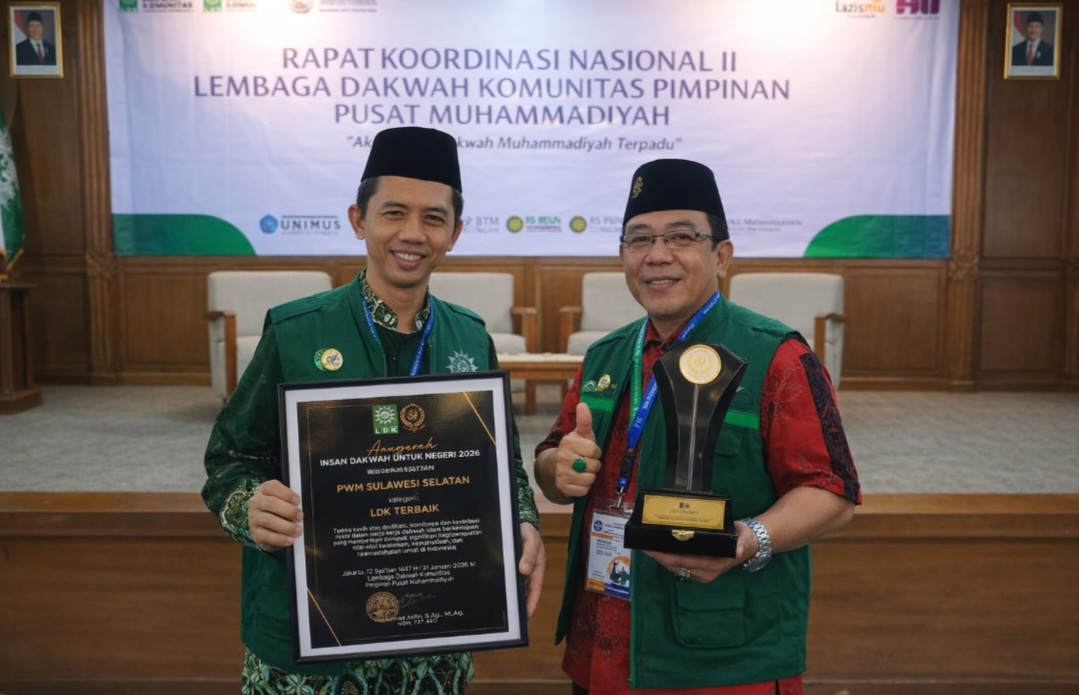 KHITTAH.CO, SEMARANG – Lembaga Dakwah Komunitas (LDK) Pimpinan Wilayah Muhammadiyah (PWM) Sulawesi Selatan menorehkan prestasi gemilang di kancah nasional. LDK PWM Sulsel resmi dianugerahi penghargaan sebagai “LDK Terbaik” pada Anugerah Insan Dakwah Untuk Negeri 2026 LDK PP Muhammadiyah.