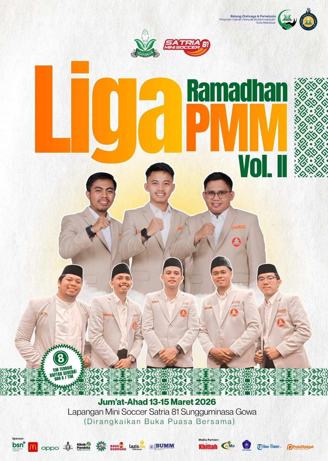 Liga Ramadhan Pemuda Muhammadiyah Makassar (PMM) Vol II resmi akan dibuka pada Jumat sore, 13 Maret 2026, di Lapangan Mini Soccer Satria 81, Sungguminasa, Gowa. Kepastian itu mengemuka setelah panitia pelaksana merampungkan technical meeting dan menetapkan jadwal pertandingan untuk seluruh tim peserta.
