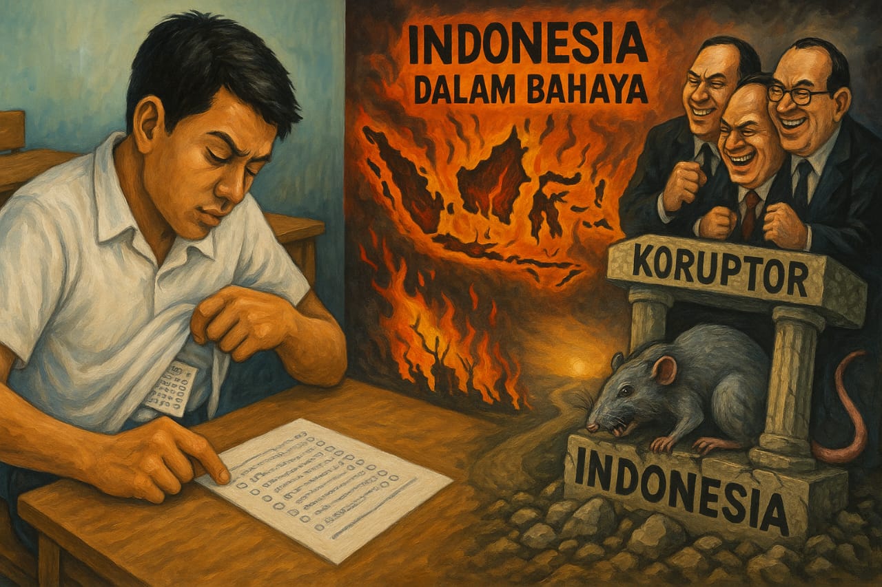 Mengapa di antara judul tulisan ini ada diksi “Indonesia dalam keadaan bahaya”? Saya pun meyakini atau memiliki sejenis hipotesis, bahwa kebiasaan nyontek itu adalah bibit terbesar korupsi. Basis sikapnya sama yaitu “tidak jujur”. Hipotesis ini bisa saja menjadi sebagai tesis, meskipun mungkin akan mengandung sejenis margin error beberapa persen. Artinya, meskipun memiliki potensi, tetapi tidak semua yang memiliki kebiasaan nyontek akan secara otomatis atau serta-merta menjadi koruptor pada masa yang akan datang. Manusia itu unik dan dinamis, bisa jadi dalam perjalanan hidupnya mendapat hidayah dari Allah Swt, atau melakukan proses pertaubatan.