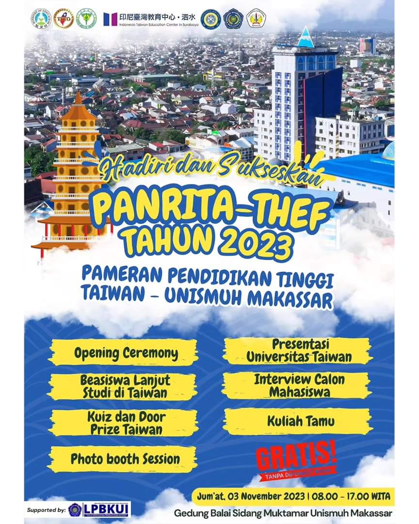 KHITTAH.CO, MAKASSAR – Universitas Muhammadiyah (Unismuh) Makassar akan menggelar Panrita Taiwan Higher Education Fair (THEF) 2023. Sebanyak 14 perguruan tinggi di Taiwan ikut berpartisipasi dalam pameran.