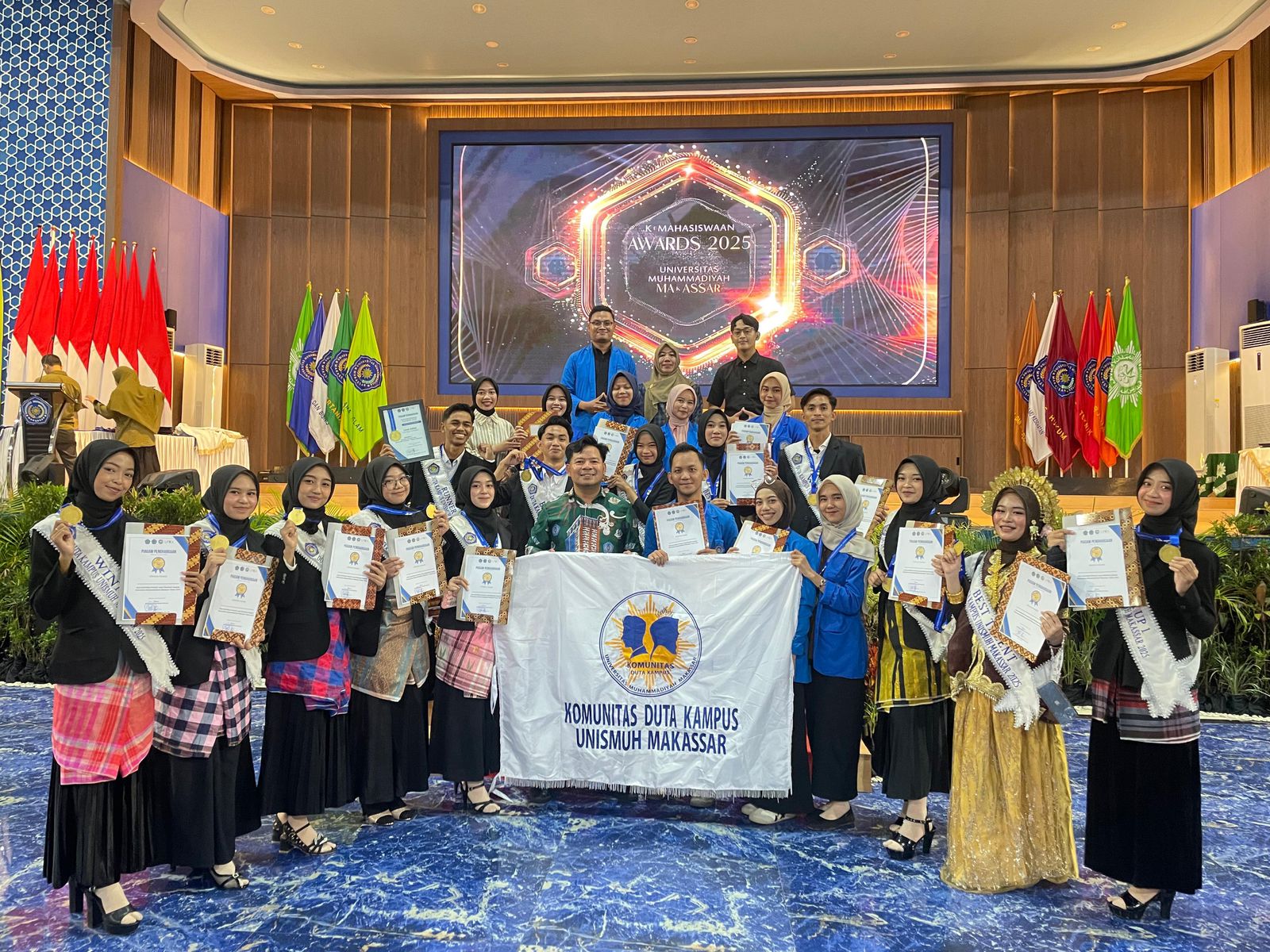 KHITTAH.CO, MAKASSAR– Komunitas Duta Kampus Universitas Muhammadiyah Makassar (Unismuh) Makassar memborong berbagai penghargaan pada ajang Kemahasiswaan Award yang diselenggarakan oleh pihak kampus. Prestasi tersebut diraih setelah puluhan duta kampus berhasil lolos seleksi ketat dan menunjukkan capaian akademik maupun nonakademik di berbagai level. Kegiatan ini digelar pada 23 Desember 2025 di Balai Sidang Unismuh Makassar.