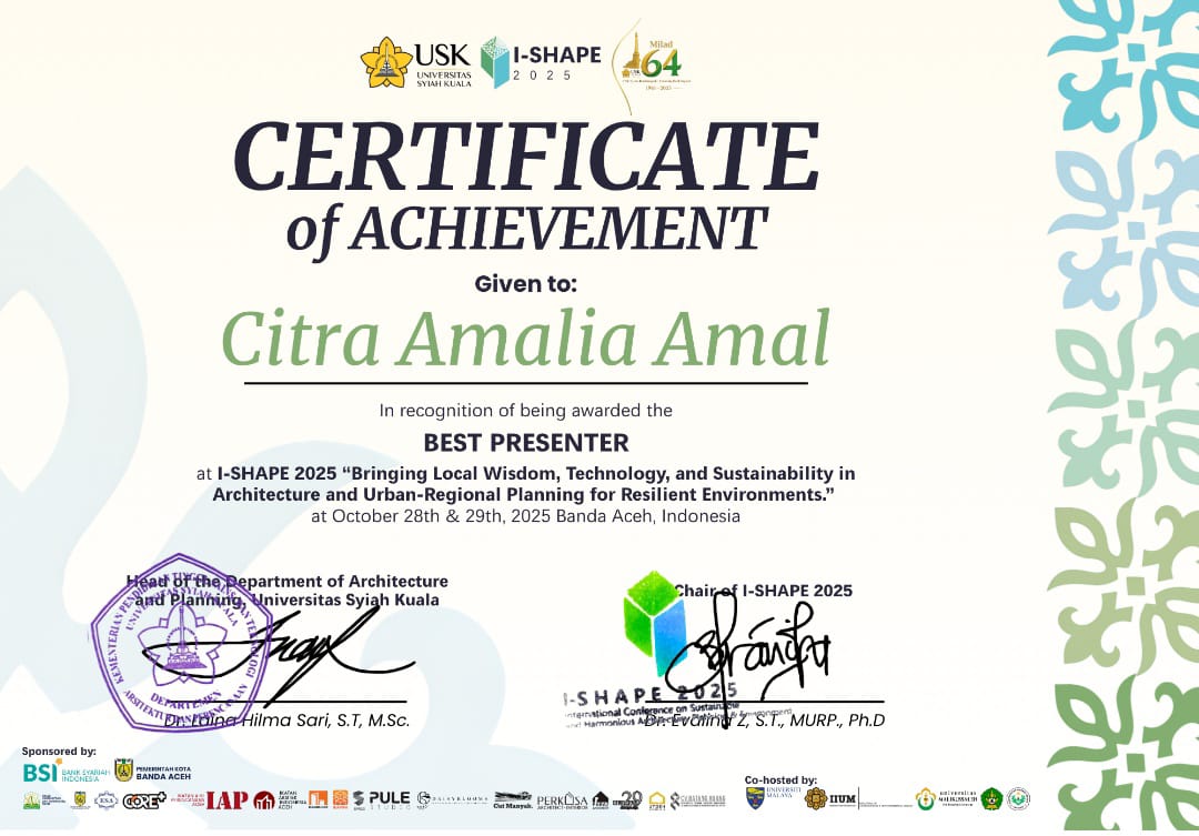KHITTAH.CO, Banda Aceh — Dosen Program Studi Arsitektur Universitas Muhammadiyah (Unismuh) Makassar, Ar. Hj. Citra Amalia Amal, S.T., M.T., IAI, meraih penghargaan Best Presenter dalam konferensi internasional I-SHAPE 2025 (International Conference on Sustainable and Harmonious Architecture, Planning & Environment) yang digelar di Banda Aceh, 28–29 Oktober 2025.