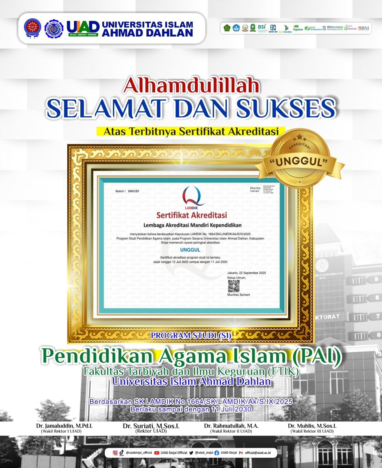 KHITTAH.CO, SINJAI — Kabar gembira dan membanggakan kembali datang dari Kampus Biru, sebutan untuk Universitas Islam Ahmad Dahlan (UIAD) Sinjai. Terbaru, Program Studi S1 Pendidikan Agama Islam (PAI) dengan Tag Line “Prodi Dunia Akhirat” Fakultas Tarbiyah dan Ilmu Keguruan (FTIK) resmi meraih Akreditasi Unggul dari Lembaga Akreditasi Mandiri Kependidikan (LAMDIK).