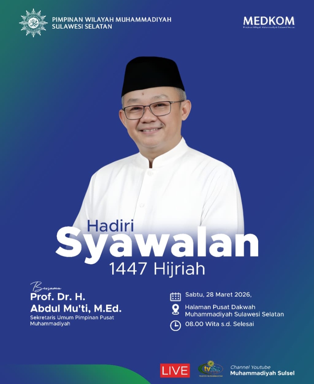 KHITTAH.CO, MAKASSAR — Pimpinan Wilayah Muhammadiyah Sulawesi Selatan memajukan pelaksanaan Syawalan 1447 Hijriah menjadi Sabtu, 28 Maret 2026, dari jadwal semula sehari sesudahnya. Kegiatan akan berlangsung di Halaman Pusat Dakwah Muhammadiyah Sulawesi Selatan mulai pukul 08.00 Wita dan menghadirkan Menteri Pendidikan Dasar dan Menengah Prof Abdul Mu’ti, M.Ed., yang juga Sekretaris Umum Pimpinan Pusat Muhammadiyah. Abdul Mu’ti dipastikan hadir untuk menyampaikan Hikmah Syawalan 1447 H.