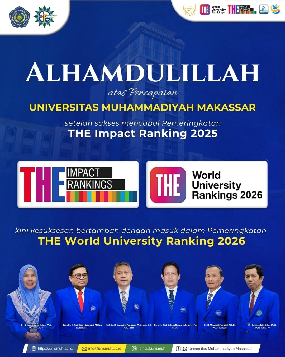Khittah.co, Makassar — Universitas Muhammadiyah Makassar (Unismuh) kembali menorehkan pencapaian di kancah global. Setelah tahun sebelumnya tercatat dalam Times Higher Education (THE) Impact Rankings 2025, kini Unismuh resmi masuk radar pemeringkatan THE World University Rankings (WUR) 2026 — salah satu pemeringkatan universitas paling bergengsi di dunia.